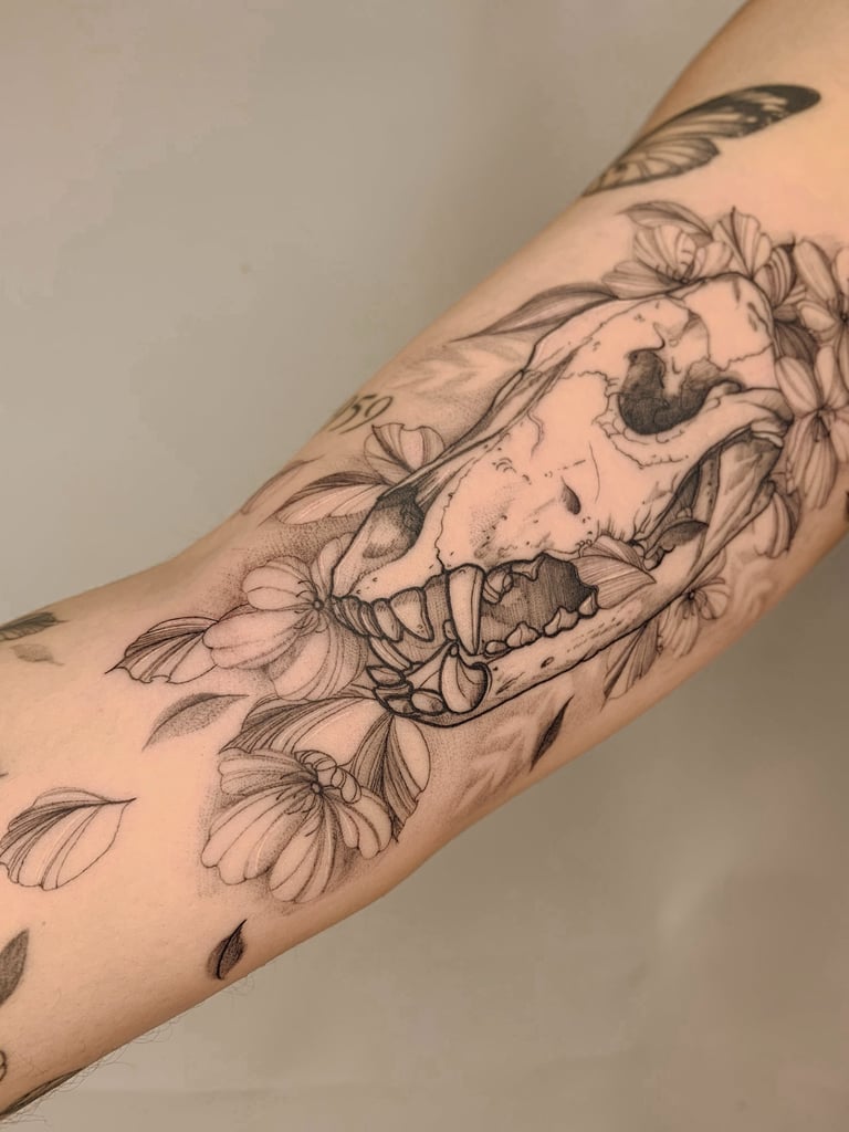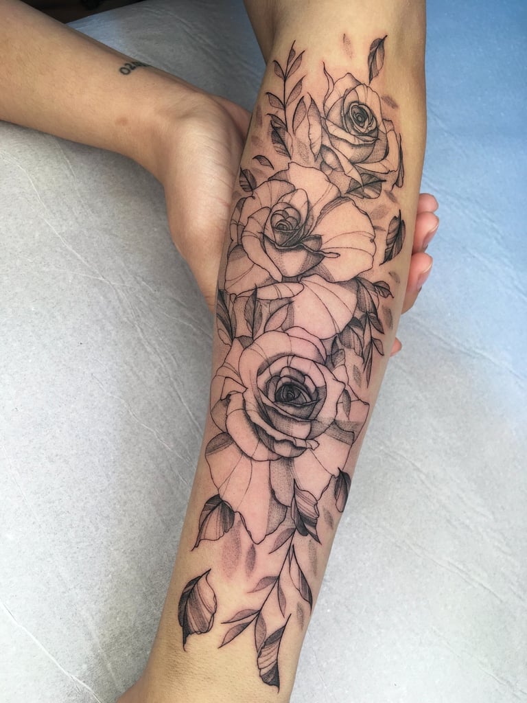Meu estilo de tattoo: composições com contraste de linhas e sombra texturizada, botânica e mini realismo.